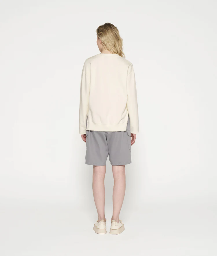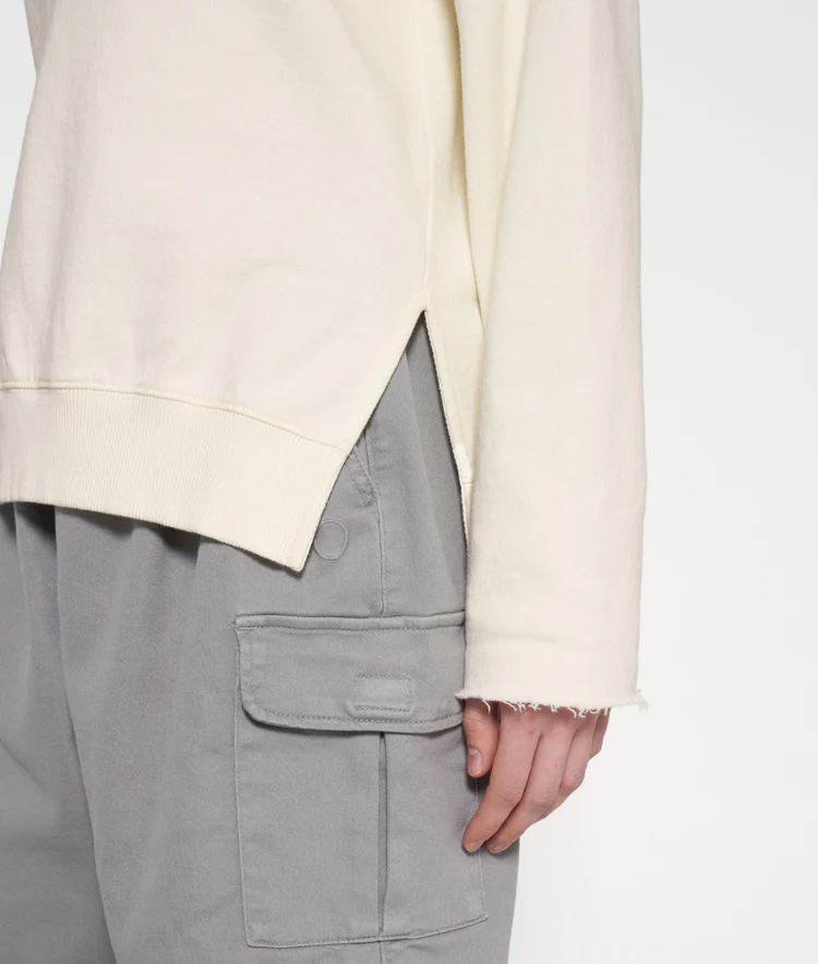 Regular Fit Sweater mit WELL BEING Glitzerprint auf der Brust aus GOTS-zertifiziertem Bio-Baumwollfleece. Mit einem Rippstrick-V-Ausschnitt, einem Rippstricksaum und kleinen Seitenschlitzen sowie Raw-Edge-Ärmelabschlüssen.