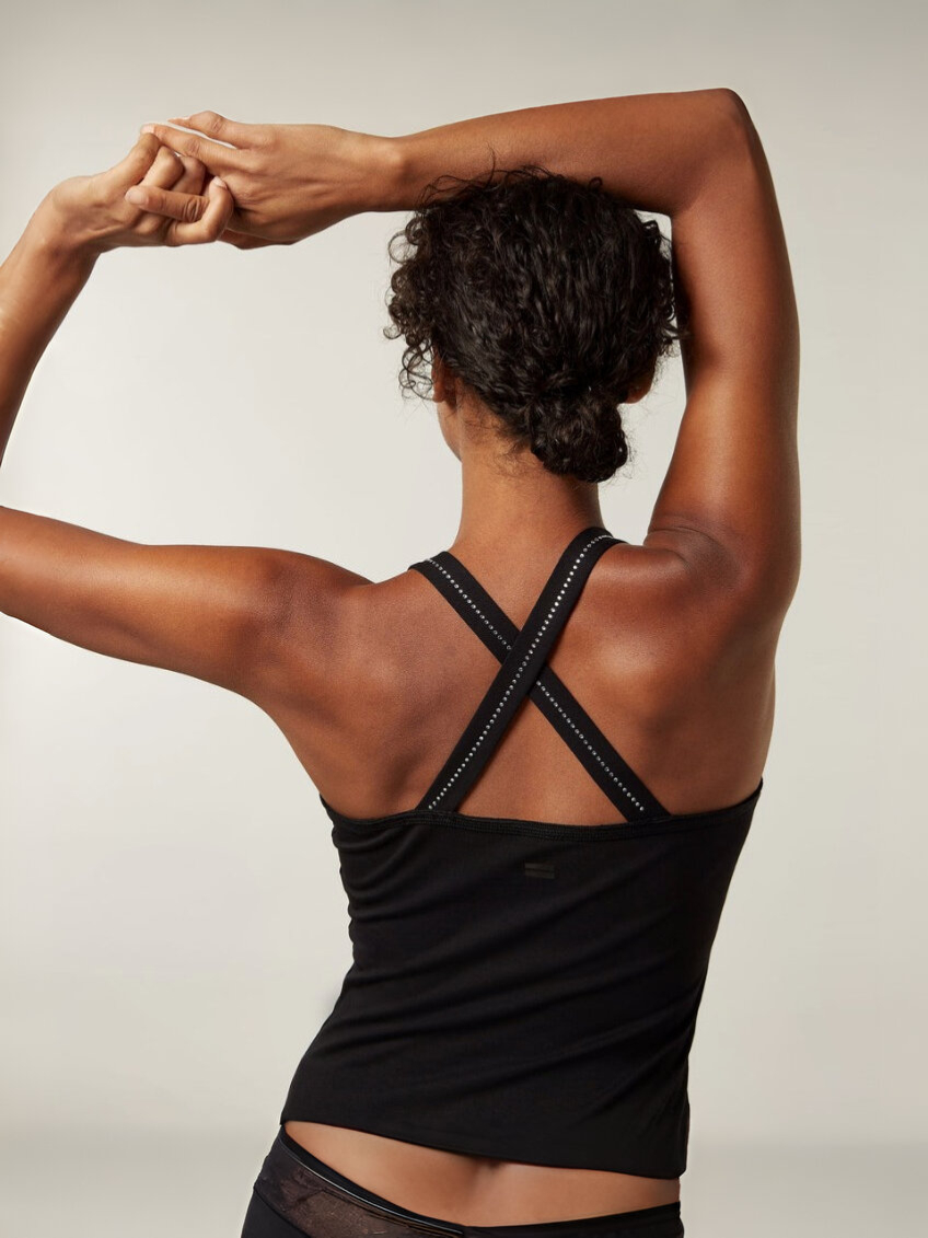 Slim Fit Singlet-Top mit im Rücken gekreuztenTrägern mit Strassbesatz, aus Bio-Baumwoll-Jersey gefertigt. Mit strassbesetzten Schulterträgern, einem Vintage-Finish am Halsausschnitt und einem rückseitig applizierten Mini Stripes Logo.
